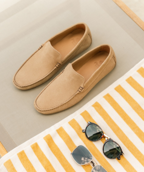 Mocassin Dandy en Veau Velours Sable sans lacet comportant une languette sous patte et généralement à plateau.